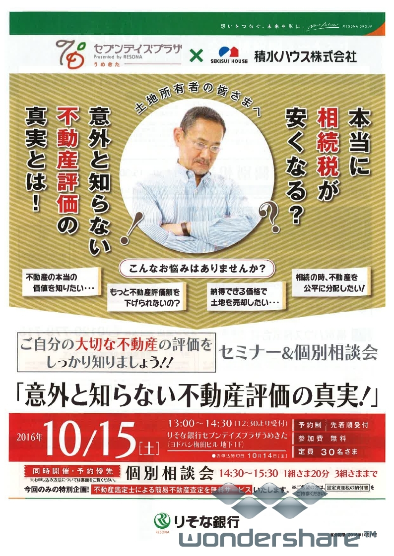 去る10月15日(土)に開催されました、りそな銀行セブンデイズプラザうめきた様と積水ハウス様とのコラボレーション企画である弊社代表によるセミナーが再度開催されます。